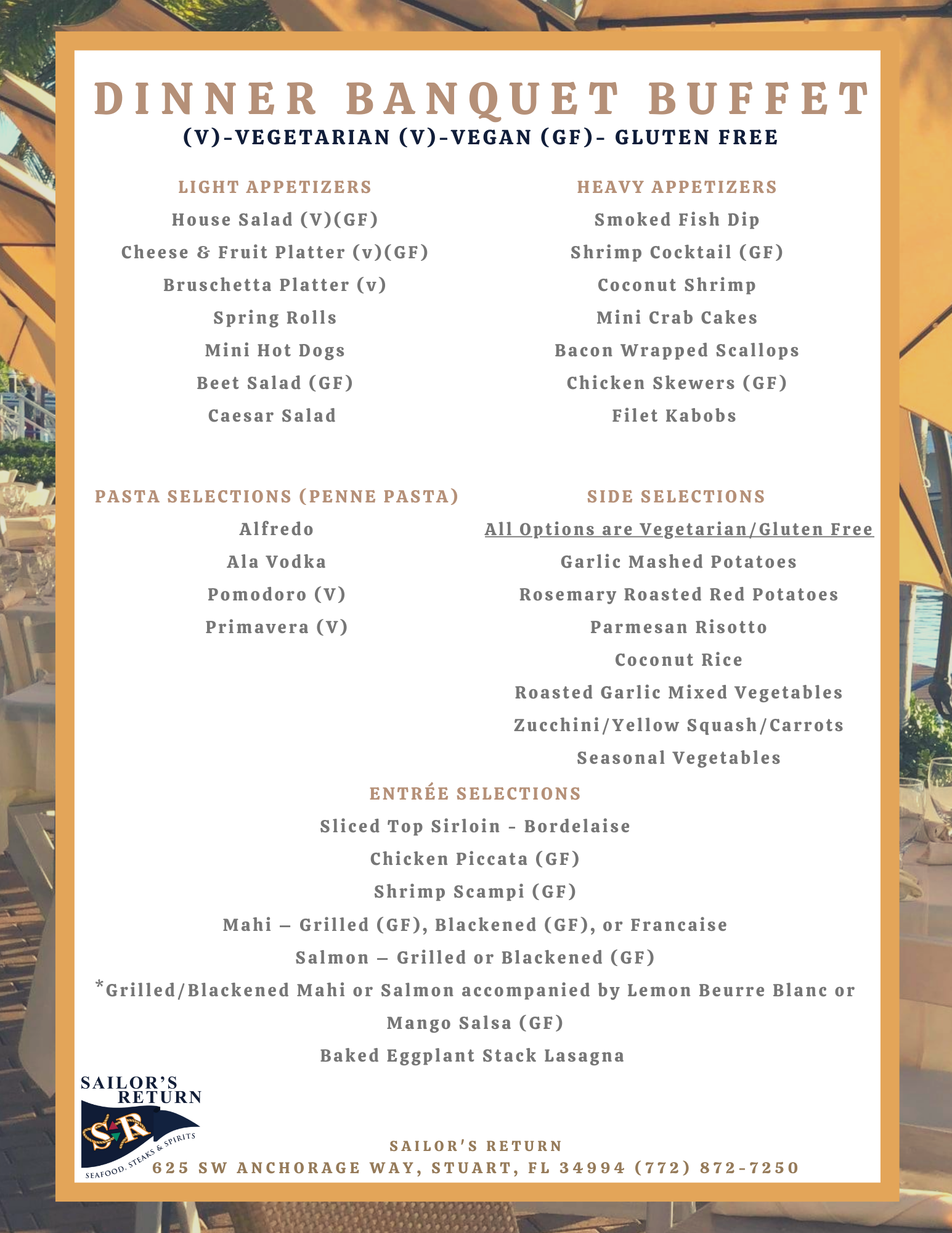 Sailor’s Return is responsible for the sale of food and beverages accordance with Florida state regulations; therefore, Sailor’s Return must supply all food and beverages, unless different arrangements are made with management in advance.
